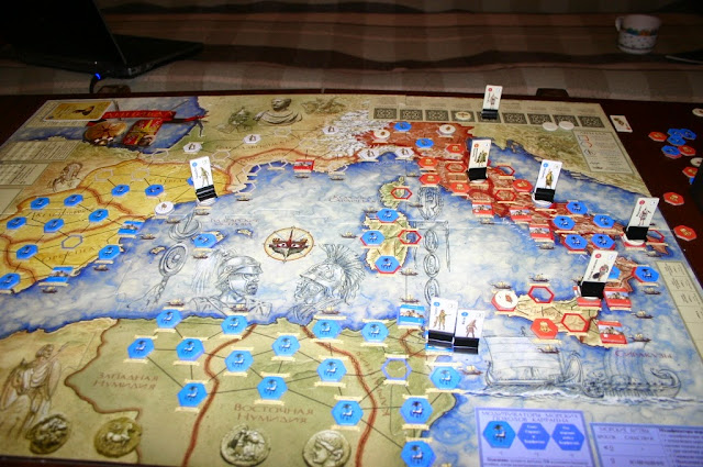 Недавно достал с дальней полки "Ганнибала", и провёл две отличные игры. В первой мы с другом вспоминали правила, иногда делали ошибки, тратили много сил на штурмы крепостей, высаживали отчаянные десанты. Ганнибал был очень воинственным, нападал на всех римлян, до которых мог дотянуться, осадил Рим, но взять его не смог. Римляне накопили три мощных армии и, проигрывая сражение за сражением, обескровили армию Ганнибала, загнали его каблук итальянского "сапога" и, выиграв единственный бой, уничтожили "неистового пунийца" (да ещё его любимым приёмом - охватом "клещами").