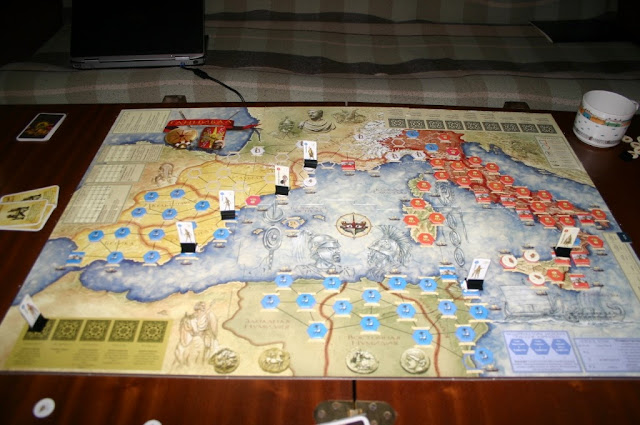 Пятый ход. Мне приходит очень удачная рука, Филипп Македонский заключает с Карфагеном союз и у нас опять бонус к движению по морю. Ганнибал с помощью карты "Дипломатия" берёт под контроль Апулию. Почти весь юг Италии, кроме крепостей, контролируется Карфагеном. Крепости, к счастью, не сильно влияют на игру. (Кстати, есть вариант игры, в котором они становятся очень важными - без контроля над крепостью нед контроля над провинцией. Но и возможность успешного штурма крепостей увеличена).