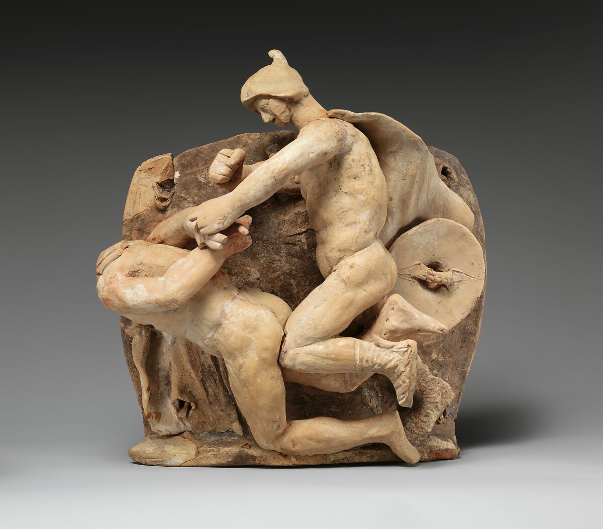 Что вовсе не отрицает возможность крепить такой щит в районе локтя, как на приведённой выше статуэтке - я подобных изображений (где круглый щит в районе локтя находится) 2 или 3 видел. Крепёж не особо понятен, но как я понимаю, он мог или на ремне в этом положении удерживаться или рукоять несколько отстояла от щита, что позволяло пропустить руку по локоть под неё.. уж не знаю как было на самом деле